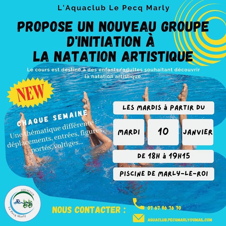 Un cours d’initiation destiné à des enfants/adultes qui veulent découvrir la natation artistique ouvre le mardi 10 janvier de 18:00 à 19:15 à la piscine de Marly Le Roy